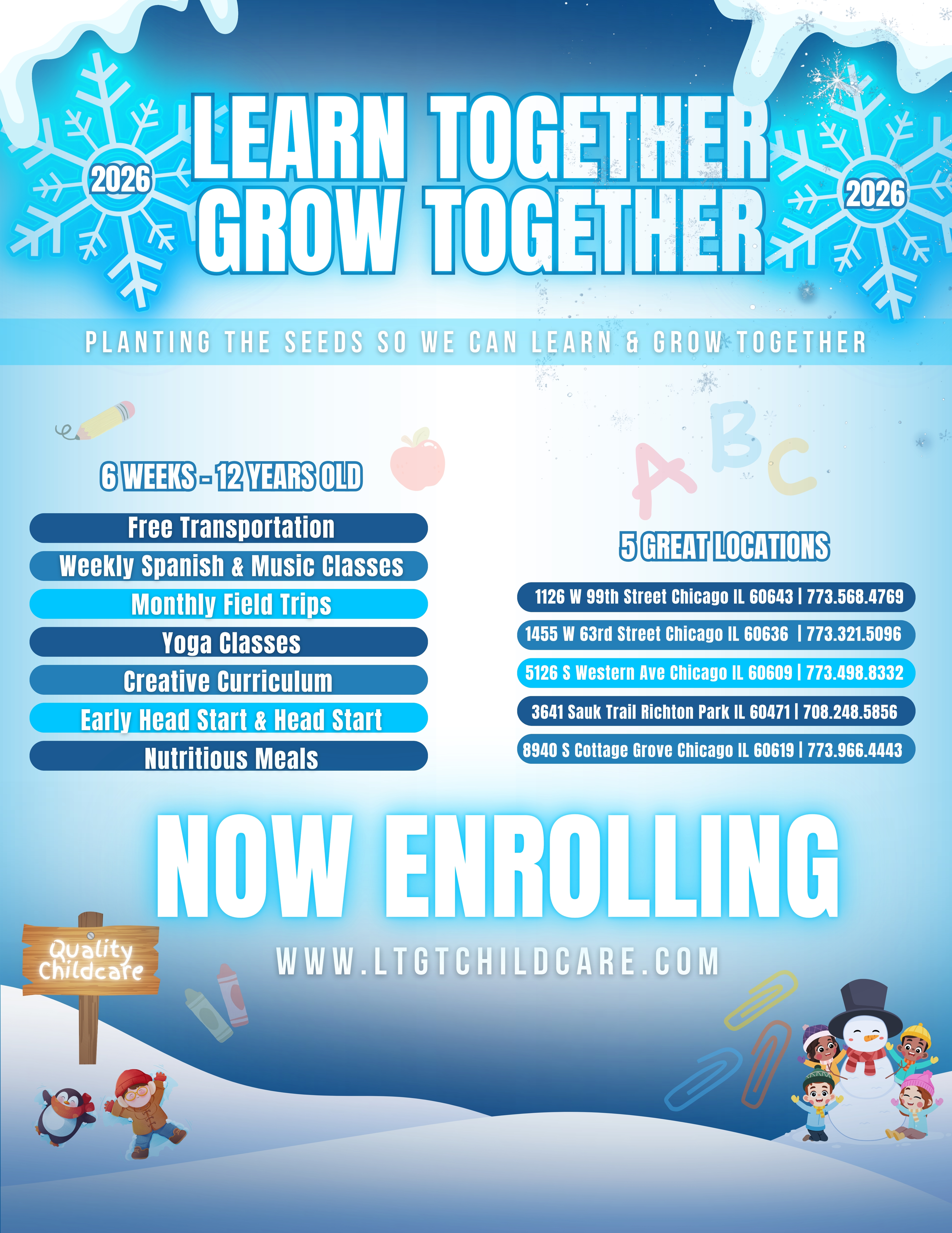 The mission of Learn Together Grow Together (LTGT) is to provide quality childcare and resources to children and families. Parents can be assured that their children are being cared for in a safe and loving environment while they are at work or school. LTGT will provide a stimulating early care and educational experience to all children, which include promoting each child‘s social/emotional, physical and cognitive development.